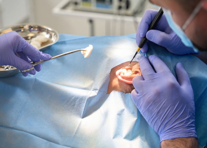 Ear surgery is a medical procedure performed to treat various conditions affecting the ears, including hearing loss, ear infections, structural abnormalities, and injury. Common procedures include tympanoplasty (repair of the eardrum), cochlear implants, and surgeries to correct deformities like prominent ears or otosclerosis. These surgeries aim to improve hearing, prevent further damage, or restore the aesthetic appearance of the ears.